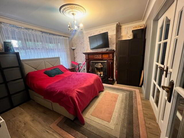 Living room 3.64x3.61m Quality laminate wooden flooring, open grate fireplace, french doors leading to dining room, cornice coving to ceilings